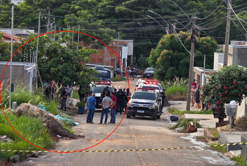 Policiais na porta da casa (círculo), já após a contenção do homem, na tarde desta sexta-feira/ Foto: Raimundo – Correio de Carajás