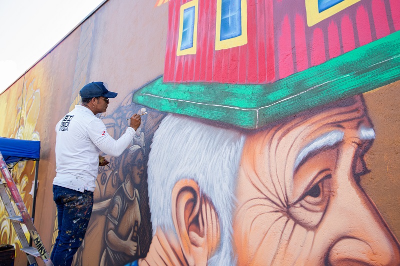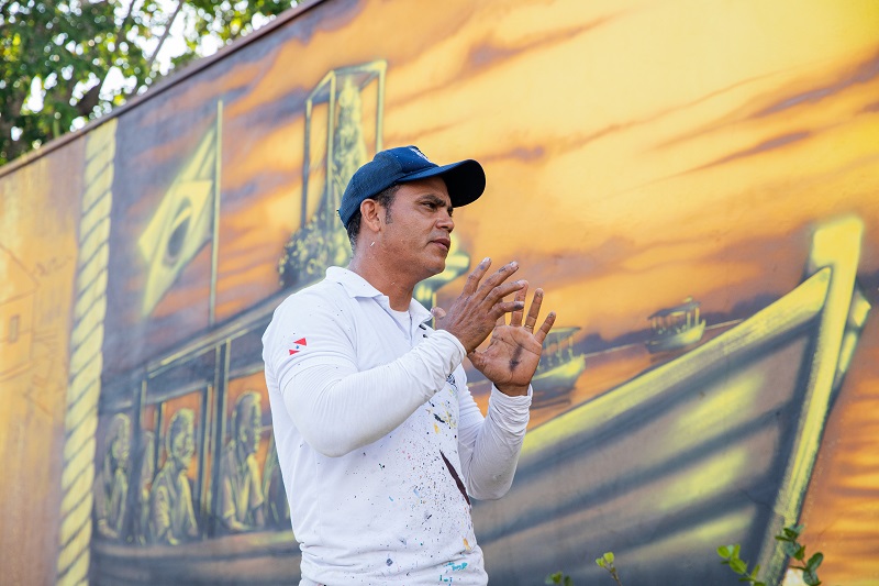 Ao longo de 70 metros, o mural reúne sete pinturas que contam a história do Círio marabaense. Em entrevista ao Correio de Carajás, Bino detalhou o processo criativo e a mensagem que deseja transmitir. “Quem me convidou foi o padre Denir, atual pároco, e essa ação é uma parceria entre a Prefeitura e o Santuário de Nossa Senhora de Nazaré”, explica.