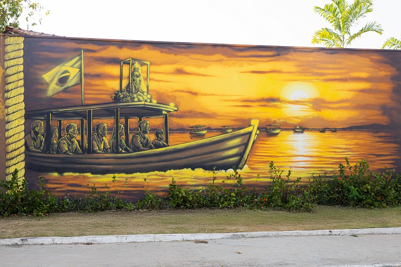 Leia mais:O primeiro painel de Bino homenageia a Irmã Neves, uma das idealizadoras da procissão. Ela é retratada segurando a imagem de Nossa Senhora de Nazaré ao lado de outras mulheres que ajudaram a construir a festa da fé no município. Já no segundo, o artista celebra o Círio Fluvial, com o belo pôr do sol marabaense sendo regido pela proteção da padroeira do Pará.