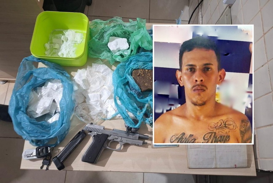Com o apoio de outras viaturas, os policiais localizaram a quitinete onde o proprietário do veículo estaria. Ao entrarem no imóvel, os militares perceberam um forte odor de entorpecentes. Na cozinha, foram apreendidos 388 gramas de oxi, 395 gramas de cocaína e 117 papelotes da mesma droga, além de duas balanças de precisão. Em outro cômodo, foi localizada uma pistola calibre .38 e um carregador com 11 munições.