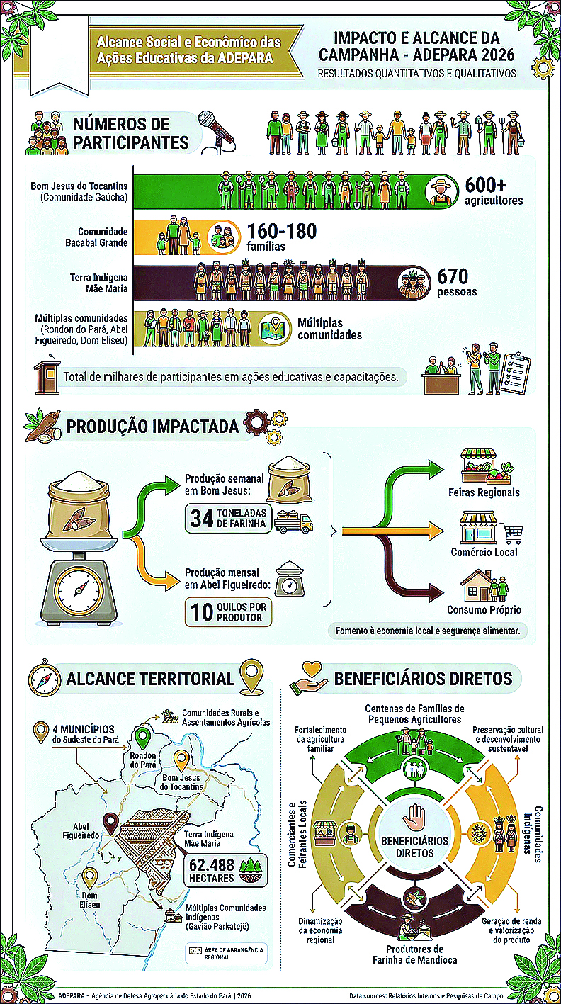O Sudeste do Pará, conhecido por sua forte produção de soja e criação de gado, também possui produção de mandioca, um cultivo essencial para o sustento de muitas famílias de pequenos agricultores. Para ajudar na proteção dessas plantações, a Agência de Defesa Agropecuária do Estado do Pará (Adepará) promoveu ações educativas nos municípios de Bom Jesus do Tocantins, Abel Figueiredo, Rondon do Pará e Dom Eliseu.