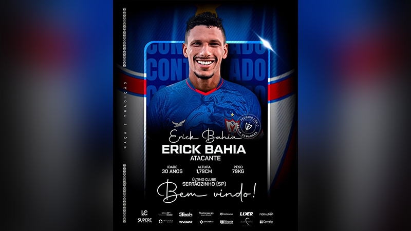 O atacante Erick Bahia, de 30 anos, é o mais novo contratado do Águia de Marabá para a temporada 2026. Anteriormente, Erick vestiu a camisa do América-GO, Morrinhos-GO e Sertãozinho-SP, onde foi campeão da Série A3 em 2025. Jogou também pelo Novo Hamburgo, Rio Branco, Anápolis e Sergipe.