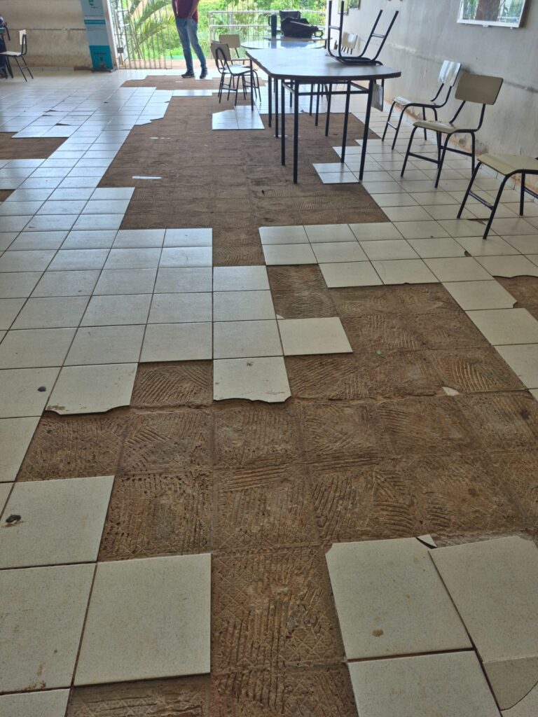 A situação de risco se estende à fachada do prédio. Segundo os relatos, foi necessária a remoção emergencial de lajotas da parte externa da edificação para evitar que as peças despencassem sobre os alunos que transitam pelo local. Além disso, problemas básicos de saneamento e conforto são rotina, como o mau funcionamento dos bebedouros da instituição, que não fornecem água potável de forma adequada.