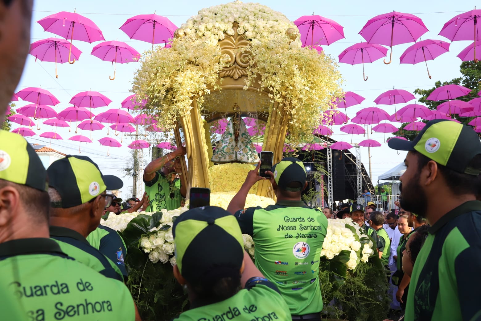 A berlinda, ornada com flores, é puxada pela corda e conduzida por fieis pelas ruas da cidade, em uma tradição que está na 45ª edição em 2025.