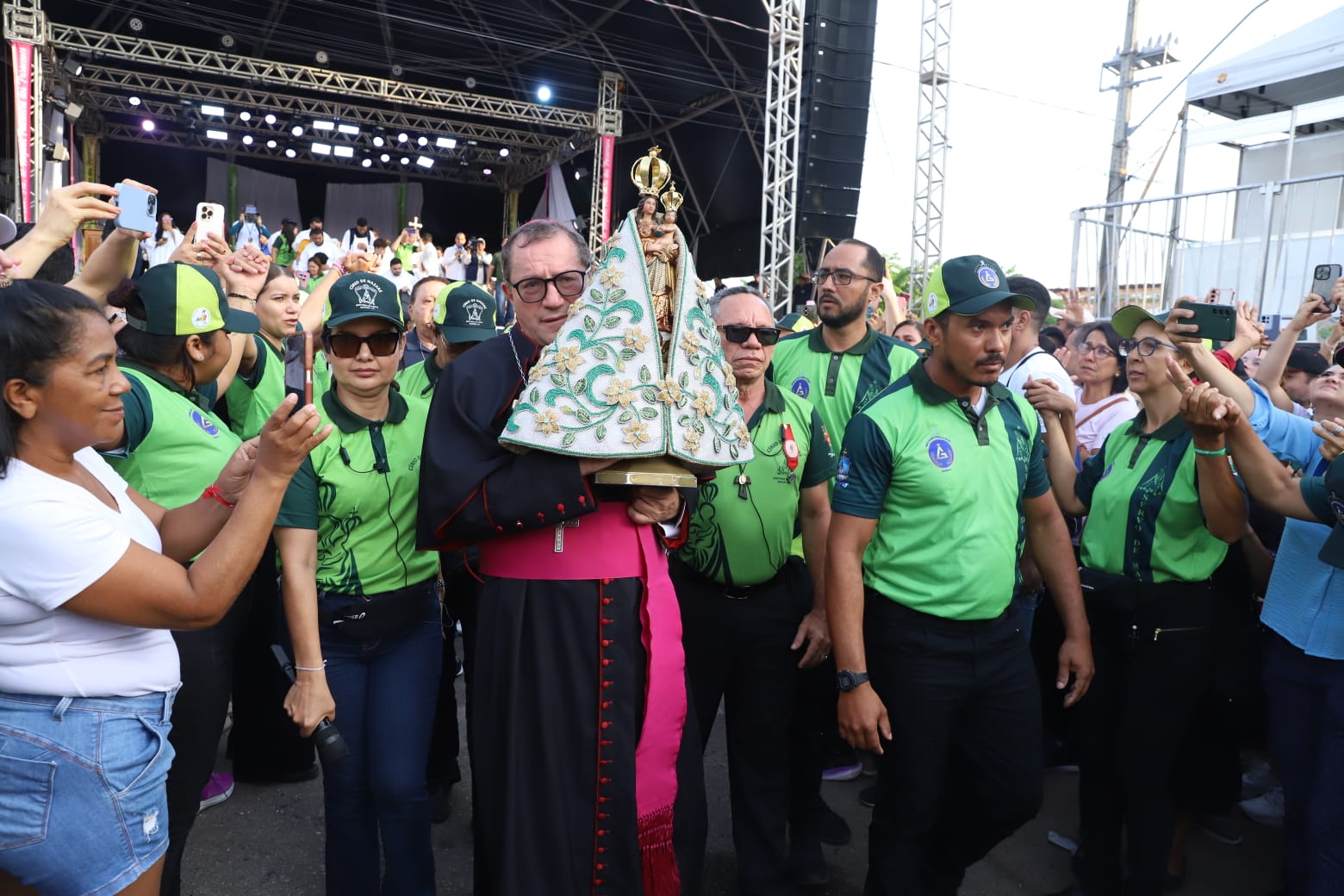 O bispo dom Vital Corbelini proferiu a última bênção durante a missa campal na Praça Duque de Caxias, centro da Marabá Pioneira e desejou uma ótima caminhada aos romeiros. Destacou que são 7,5 km até o Santuário de Nossa Senhora, na Folha 16.