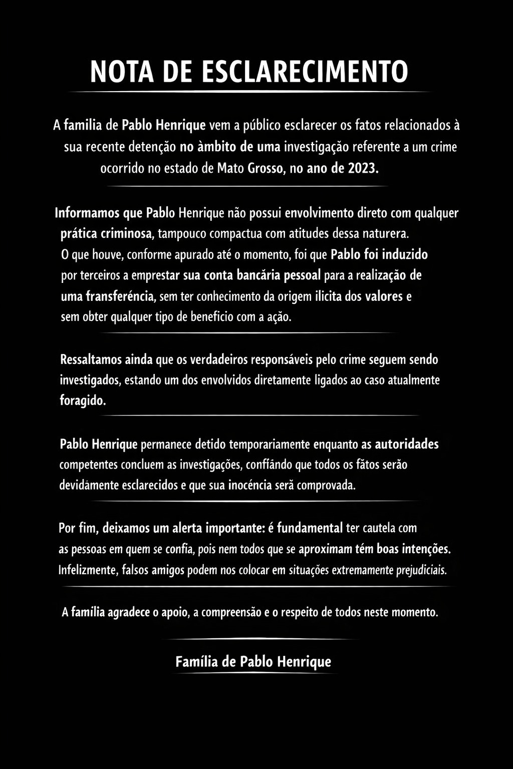 No comunicado, os familiares afirmam que Pablo não tem envolvimento direto com práticas criminosas. Segundo a nota, ele teria sido induzido por terceiros a emprestar a própria conta bancária para a realização de uma transferência, sem conhecimento da origem ilícita dos valores e sem obter qualquer benefício com a operação.