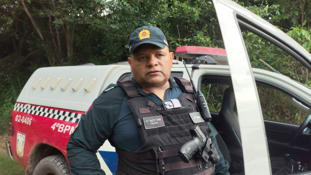 “Na varredura aqui dentro das Folhas, nos deparamos com dois elementos em uma moto; um pulou da moto e empreendeu fuga na mata; o outro desceu sentido ao abrigo dos idosos (Lar São Vicente); e aqui eles desceram uma rua e não conseguiram mais retornar; caíram na água e estão dentro do rio”, relata o sargento.