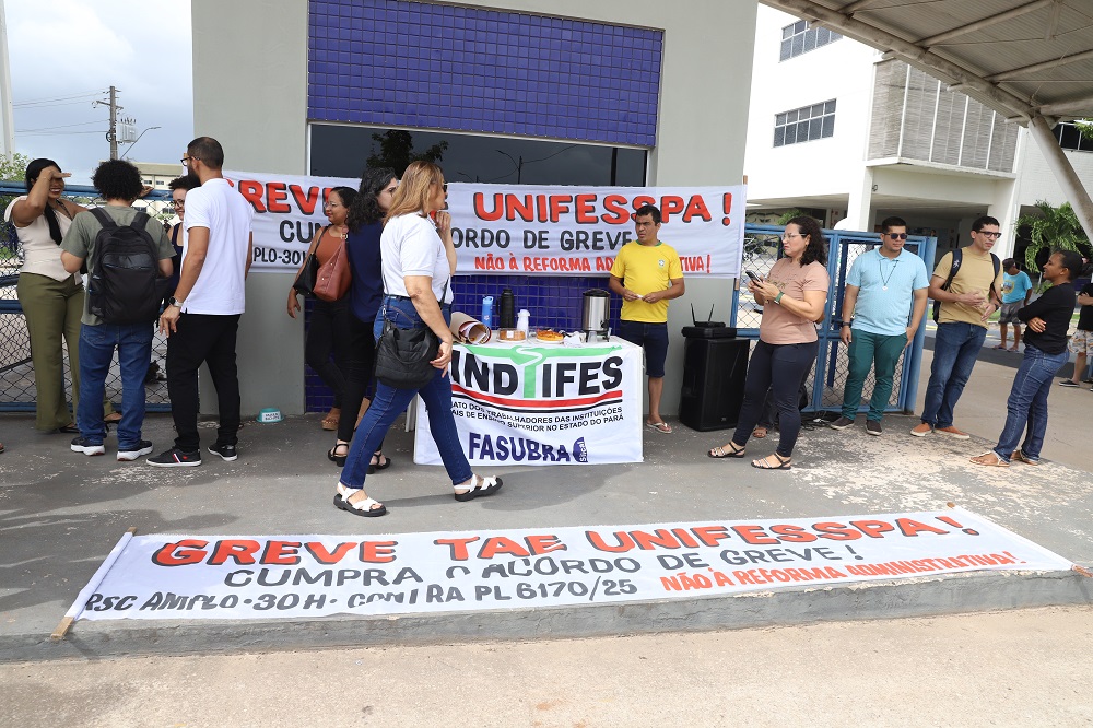 Na tarde desta sexta-feira (27), durante a visita do ministro da Educação, Camilo Santana, à Universidade Federal do Sul e Sudeste do Pará (Unifesspa), servidores técnico-administrativos da instituição realizaram uma mobilização para cobrar o cumprimento de um acordo firmado após a greve de 2024 e reivindicar melhores condições de trabalho e orçamento. O ato ocorreu em meio a uma nova paralisação da categoria, deflagrada no dia 23, conforme informou o coordenador da seção sindical, Igor Vinícius de Oliveira.