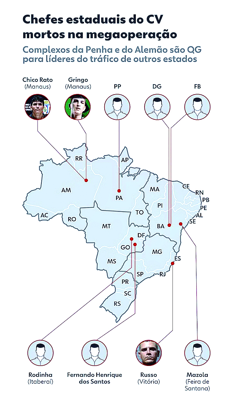 Segundo o secretário de Polícia Civil, Felipe Curi, os complexos da Penha e do Alemão passaram a ser o QG do Comando Vermelho (CV) em nível nacional, e o centro de decisão para todos os outros estados em que a facção criminosa atua. “[Nesses locais] são feitos treinamentos de tiros, para os marginais serem formados aqui e voltarem aos seus estados de origem para disseminar a cultura da facção”, afirmou o secretário.