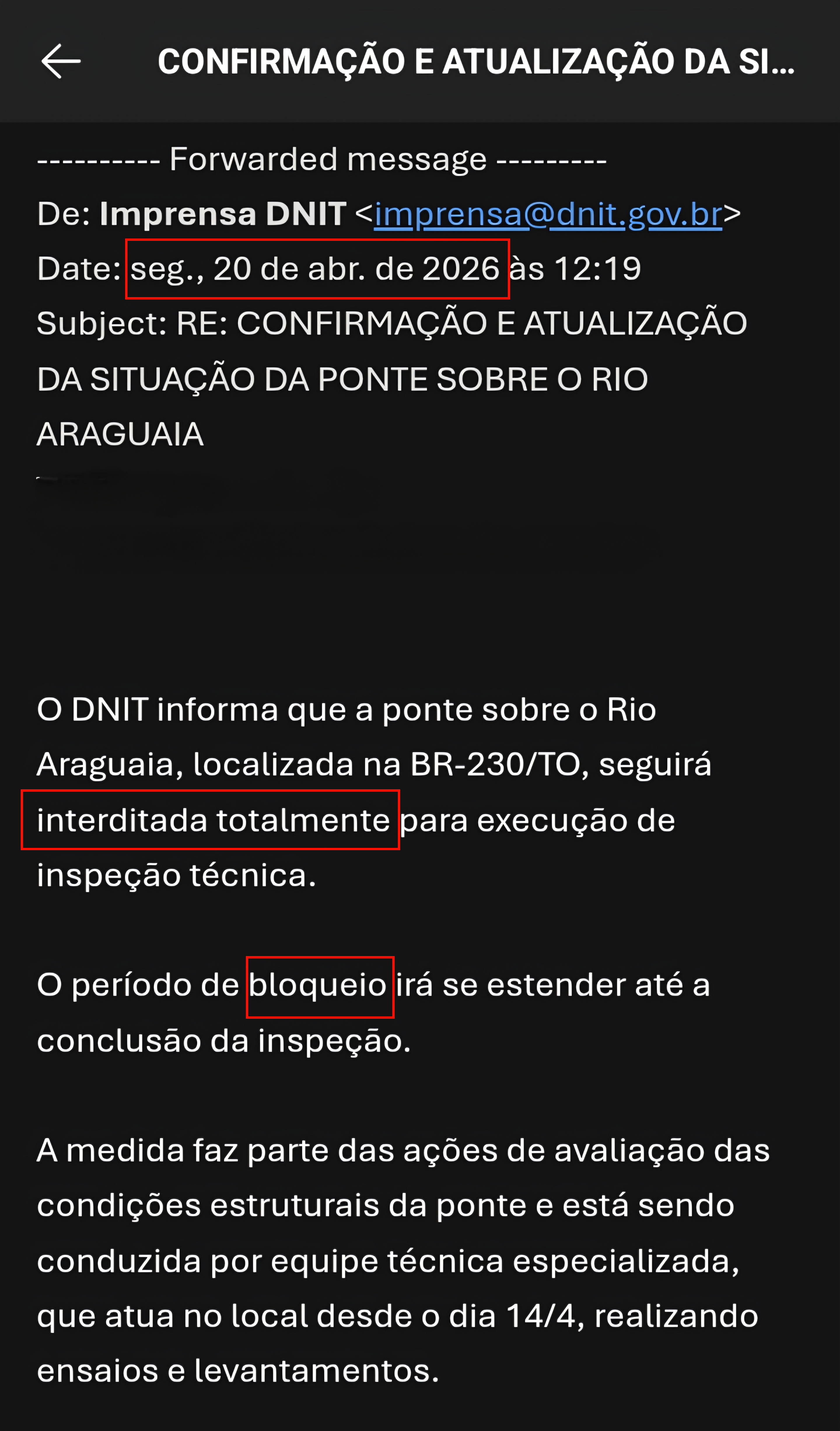 O DNIT reforça que as equipes técnicas continuam monitorando ininterruptamente as condições da estrutura e que novas atualizações sobre o andamento da inspeção e a possível liberação do tráfego serão divulgadas conforme o avanço das avaliações. Enquanto isso, o setor de transporte de cargas e a população local aguardam com apreensão o diagnóstico final sobre o futuro da ponte.