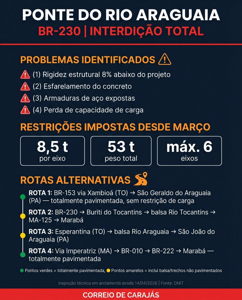 A travessia entre os estados do Pará e do Tocantins pela BR-230 (Rodovia Transamazônica) sofreu um duro golpe logístico. O Departamento Nacional de Infraestrutura de Transportes (DNIT) confirmou a interdição total da ponte sobre o Rio Araguaia, que liga os municípios de Araguatins (TO) e Palestina do Pará (PA). A medida drástica, segundo o órgão federal, é essencial para garantir a segurança dos usuários e permitir a execução de uma inspeção técnica minuciosa na estrutura, que já vinha apresentando sinais preocupantes de desgaste.