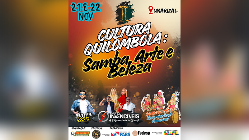 Nos dias 21 e 22 de novembro, a Vila de Umarizal, no município de Baião, será palco de um evento que celebra a ancestralidade, a arte e o samba: o Projeto “Cultura Quilombola – Samba, Arte e Beleza”, uma realização da LC Eventos – Ensino, Arte e Cultura, sob coordenação de Lorran Menezes e Cláudio Yaguara.