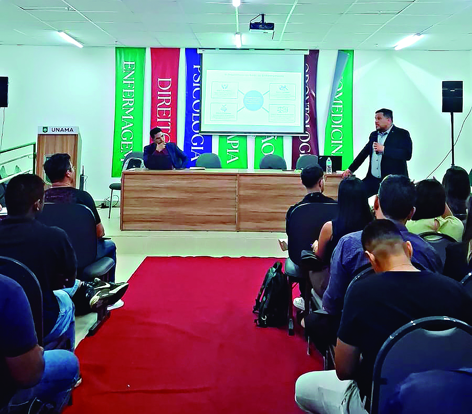 Como ação integrante do projeto institucional “O Despertar Cidadão: O Ministério Público nas Escolas” e em atenção ao Mês da Mulher, o Ministério Público do Estado do Pará (MPPA) promoveu, na segunda-feira (10), uma palestra técnica para alunos de Direito da Unama Marabá com o tema: “Respeito à Mulher: Pilar de uma Sociedade Justa”. o evento demonstrou aos futuros juristas o papel constitucional do MP na defesa dos direitos femininos. A mesa foi composta pelos promotores de justiça Erick Fernandes e Jairo do Socorro dos Santos da Costa.