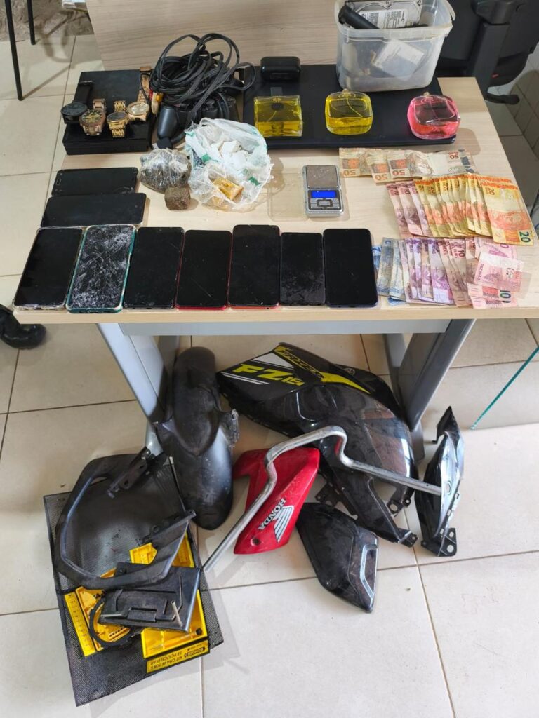Drogas, dinheiro, balança e peças de motocicletas foram apreendidas