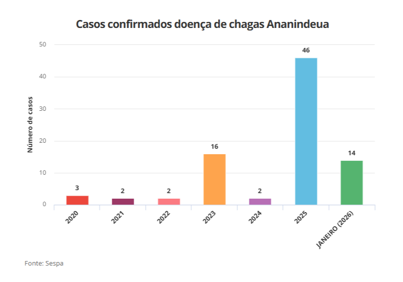 O números de mortes confirmadas por doença de chagas supera até o dados registrados em Belém. De 2020 até janeiro de 2026, a capital paraense contabilizou três mortes.