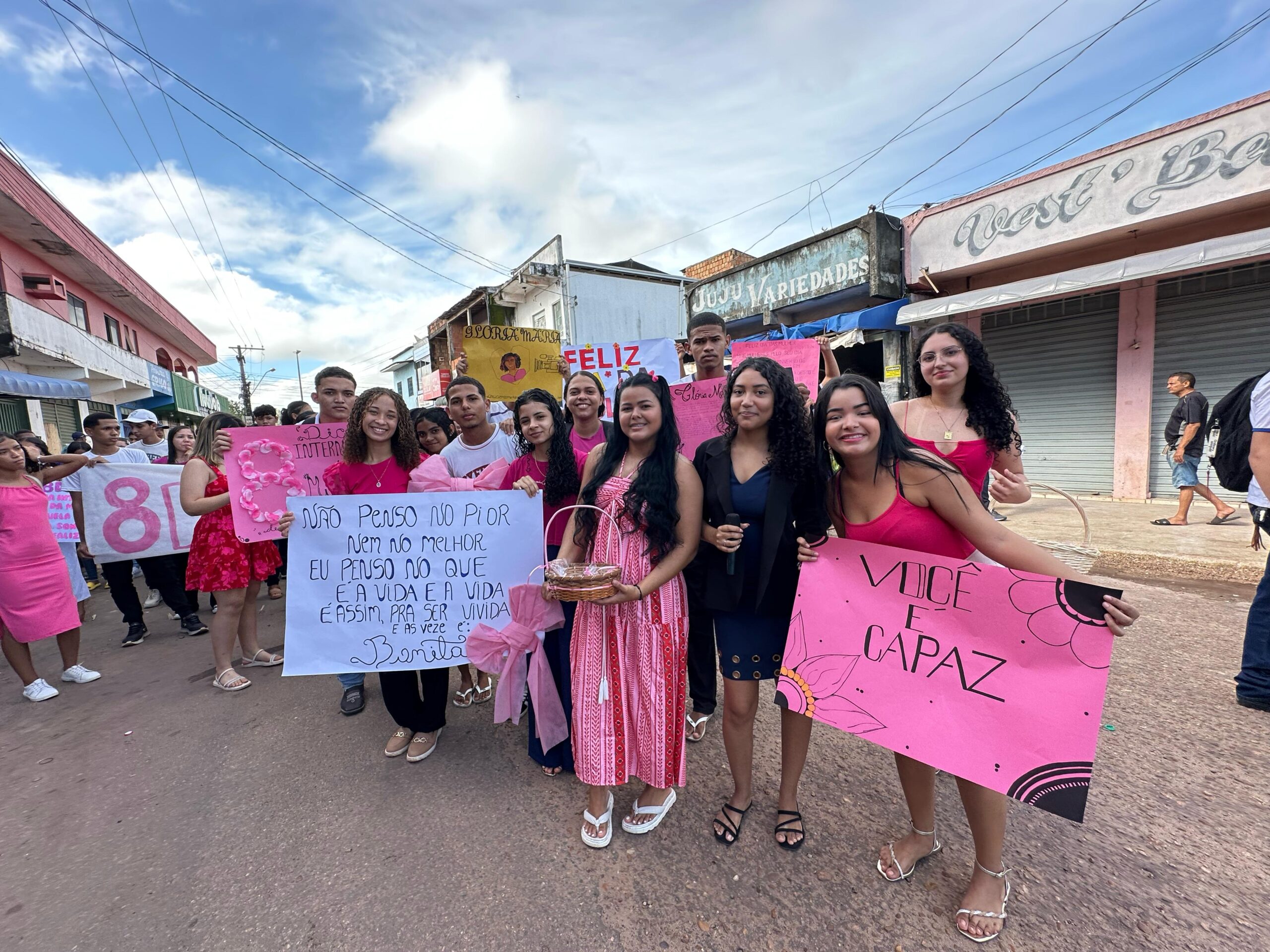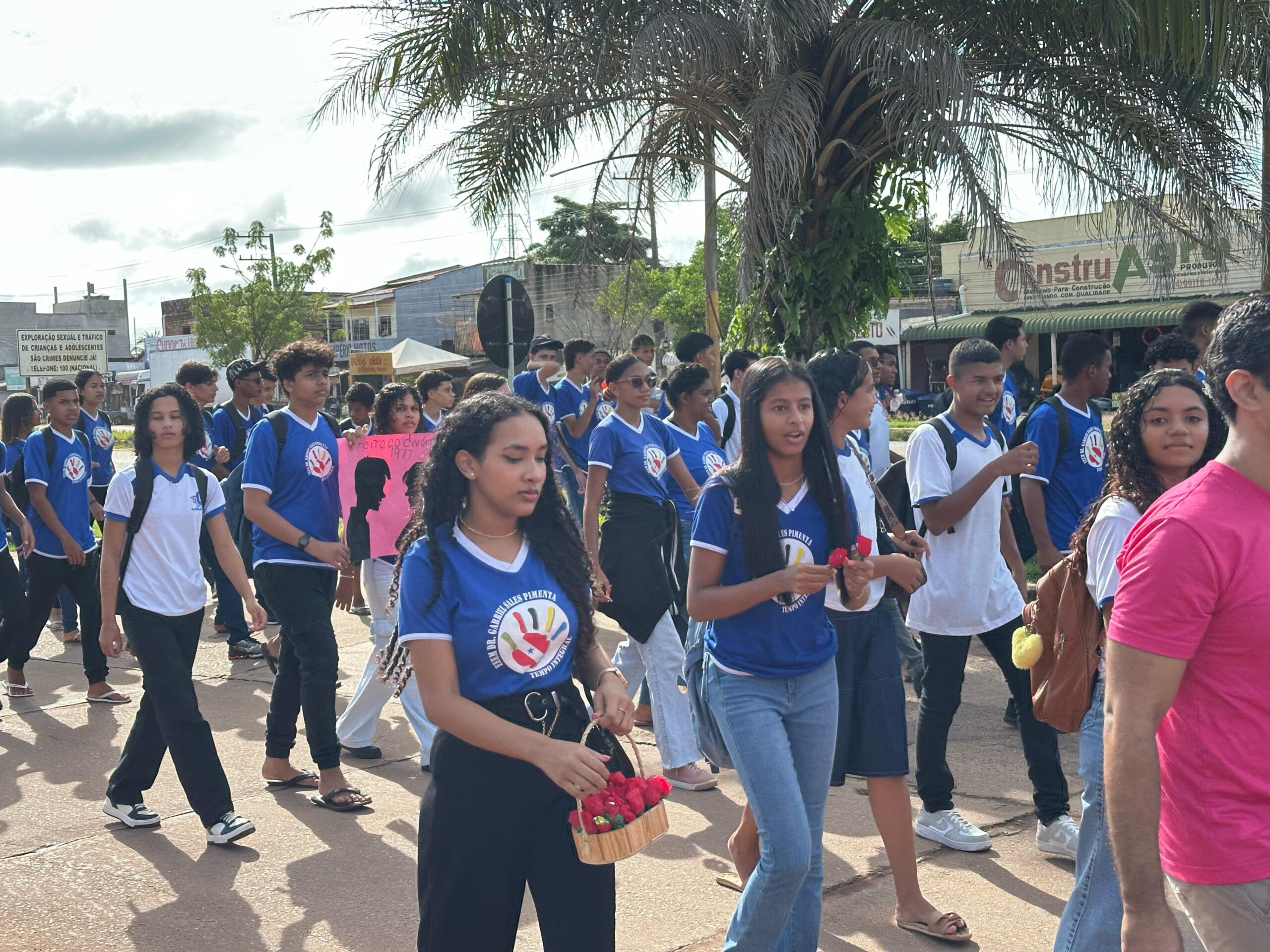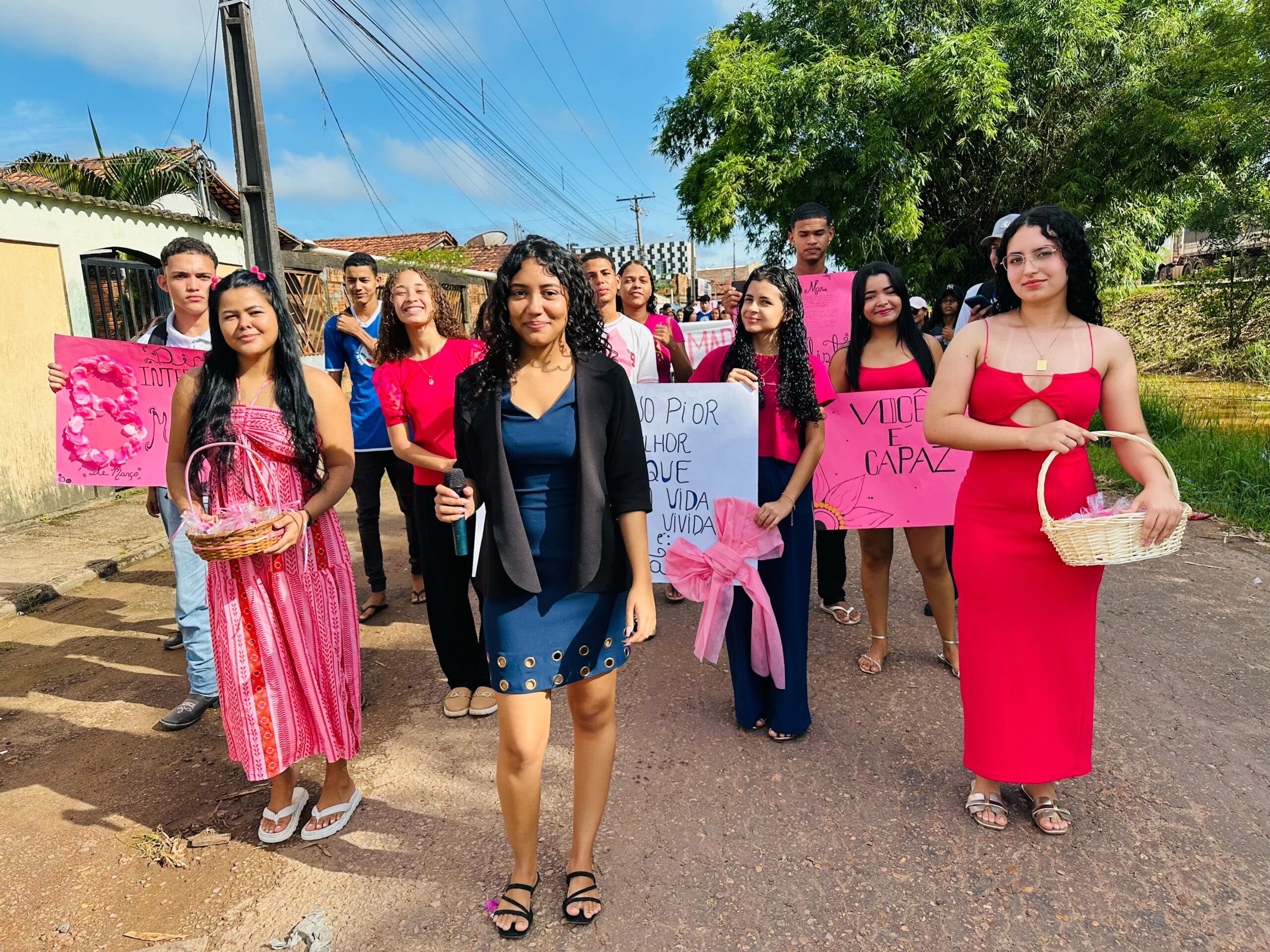 Estudantes, professores e a gestão da Escola Estadual de Ensino Médio de Tempo Integral “Dr. Gabriel Sales Pimenta” participaram na manhã de hoje, sexta-feira, 7, de 1,5 km de caminhada nas ruas do Bairro Morada Nova, em Marabá, sudeste estadual, em alusão ao Dia Internacional da Mulher, comemorado amanhã, dia 8 de março. Com cartazes e faixas em mãos com frases que enaltecem a mulher, os alunos distribuíram brindes para a comunidade e também se caracterizaram de figuras femininas importantes na história. No percurso, populares registraram o momento e receberam o carinho dos discentes. O DMTU (Departamento Municipal de Trânsito e Transporte Urbano) deu apoio durante o percurso, para evitar acidentes.