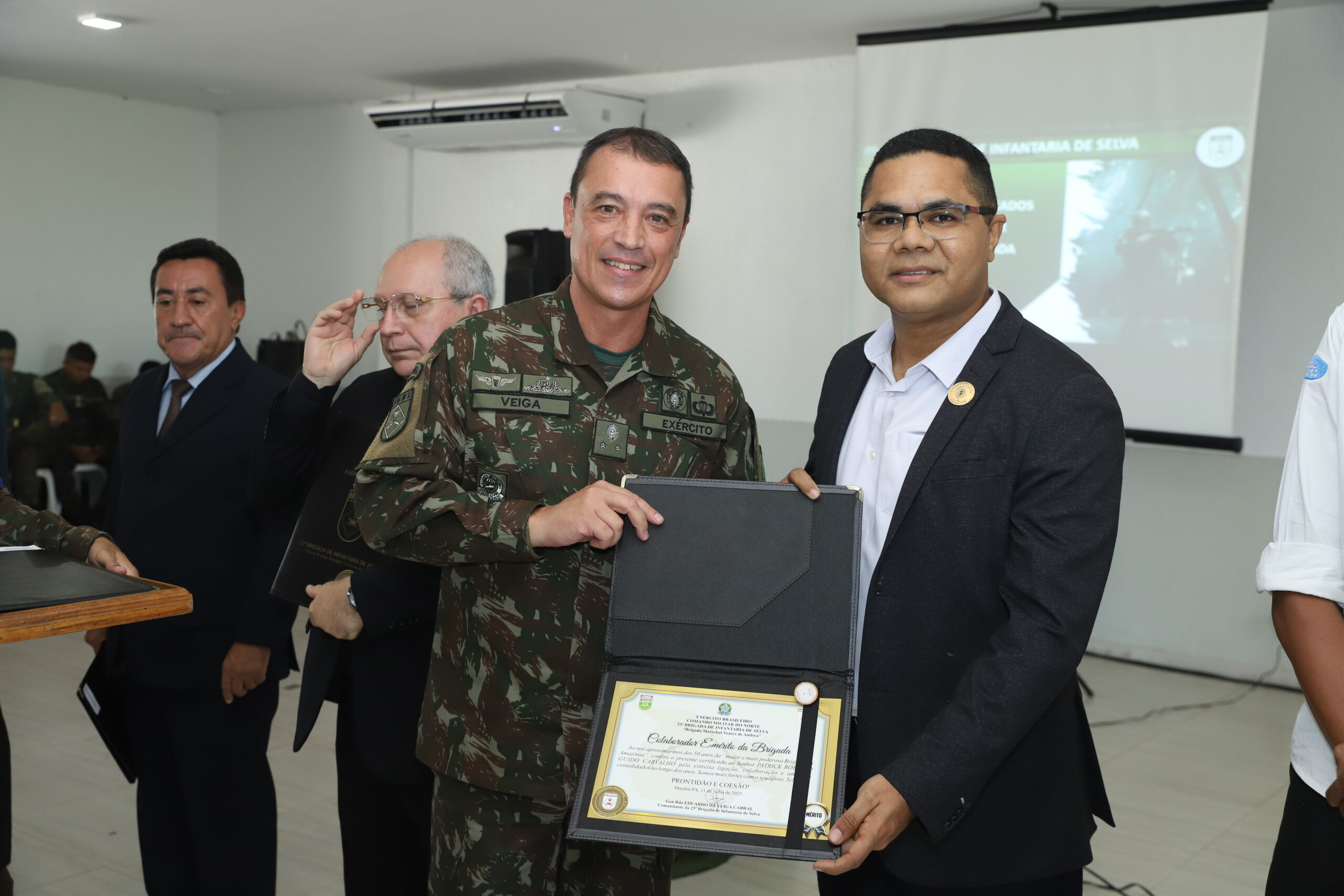 Durante a cerimônia, os agraciados receberam também uma medalha com o selo do comando, conhecida como “moeda desafio”, e um bóton distintivo com bordas douradas. A honraria foi criada para reconhecer o apoio e a amizade da sociedade civil e dos órgãos de segurança pública da região, fundamentais para os êxitos alcançados pela Brigada na missão de defender e proteger a Amazônia Oriental.