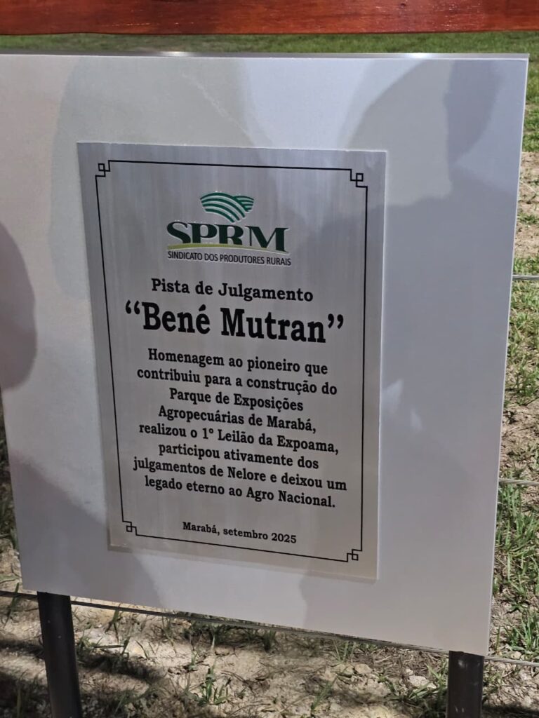 “Pista de Julgamento ‘Bené Mutran’. Homenagem ao pioneiro que contribuiu para a construção do Parque de Exposição Agropecuária de Marabá, realizou o 1º Leilão da Expoama, participou ativamente dos julgamentos de nelore e deixou um legado eterno ao Agro Nacional”.