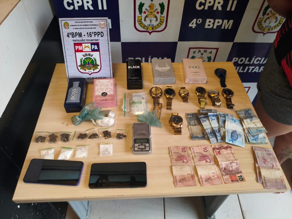 Foram encontrados, dentro de um sapateiro e entre colchões, cerca de 22 gramas e quatro papelotes de cocaína, sete papelotes de maconha e 14 gramas de crack. Uma balança, um pacote de sacos ziplock, dois celulares, cinco perfumes, oito relógios e R$ 80 também foram apreendidos. Os policiais acreditam que os objetos podem ter origem ilícita.
