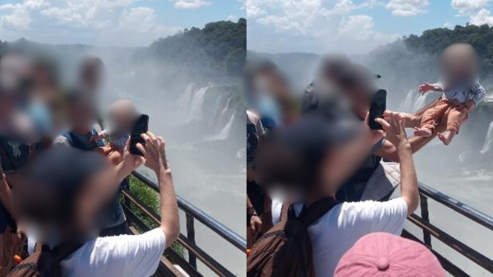 As imagens mostram o adulto erguendo o bebê no ar, a poucos metros da queda d’água, enquanto uma mulher fotografa a ação. A identidade das pessoas envolvidas não foi divulgada.