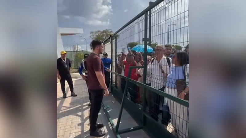 Logo após um grupo Munduruku tentar entrar no local, os portões foram fechados por cerca de 30 minutos, deixando do lado de fora indígenas, bebês e idosos sob sol forte.
