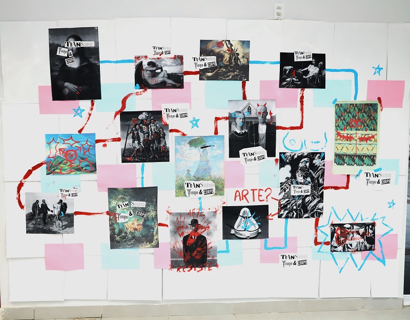 Além disso, Jean projeta na arte a esperança de um futuro mais acolhedor para a juventude, materializada na imagem de uma professora trans lecionando.