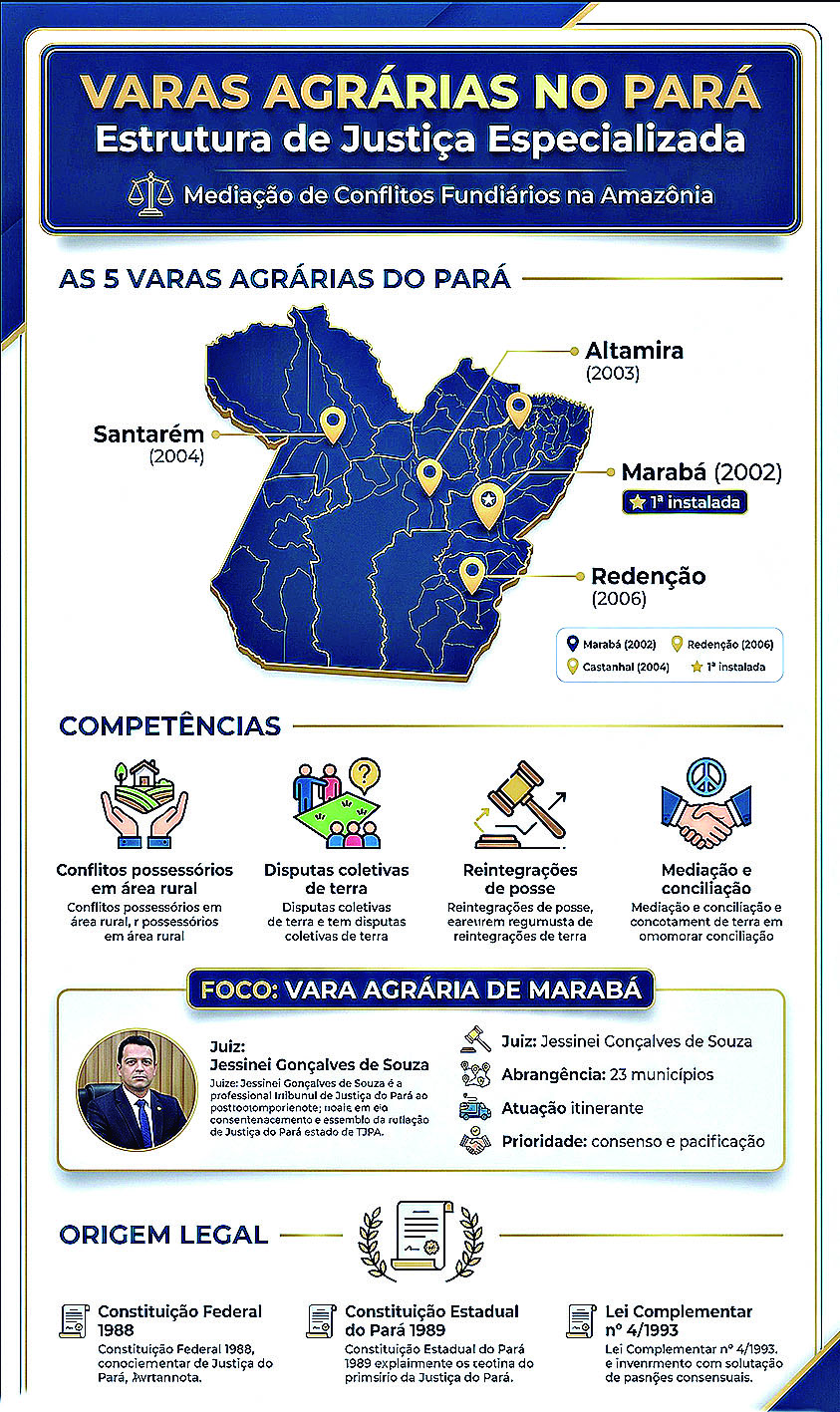 A Vara Agrária de Marabá, a primeira a ser instalada no estado em 2002, possui uma jurisdição que abrange 23 municípios do sudeste paraense, uma vasta área que inclui desde Ulianópolis e Tucuruí até Canaã dos Carajás e São Félix do Xingu.