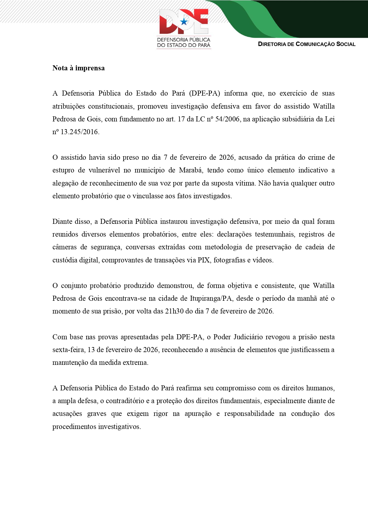 Leia mais:“O assistido havia sido preso no dia 7 de fevereiro de 2026, acusado da prática do crime de estupro de vulnerável no município de Marabá, tendo como único elemento indicativo a alegação de reconhecimento de sua voz por parte da suposta vítima. Não havia qualquer outro elemento probatório que o vinculasse aos fatos investigados”, afirma a nota da DPE-PA.