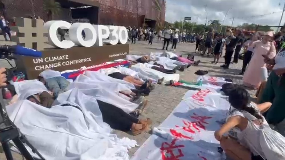 Manifestantes do México cobertos por lençóis protestam deitados em frente à COP 30 contra morte de ativistas