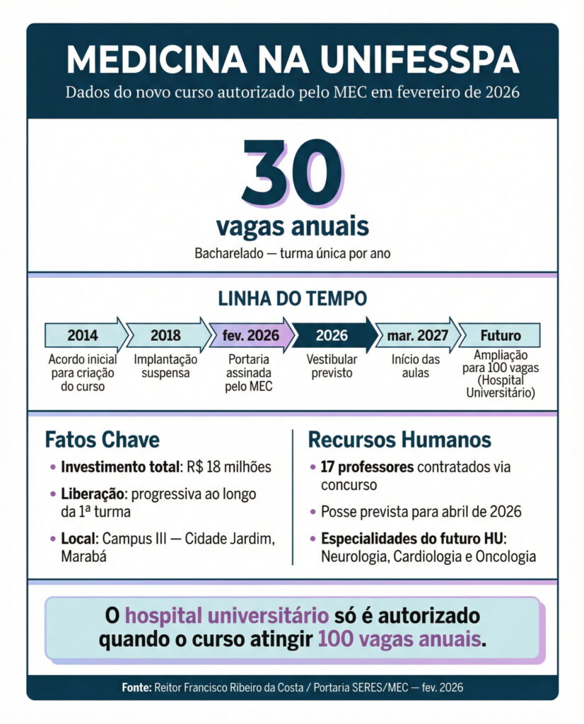 De acordo com a Portaria SERES/MEC, de 27 de fevereiro de 2026, o bacharelado em Medicina será mantido pela Unifesspa em seu Campus de Marabá. O documento oficial gerou certa confusão ao especificar o endereço como a Unidade I, localizada na Folha 31 da Nova Marabá, prédio herdado da antiga estrutura da Universidade Federal do Pará (UFPA).