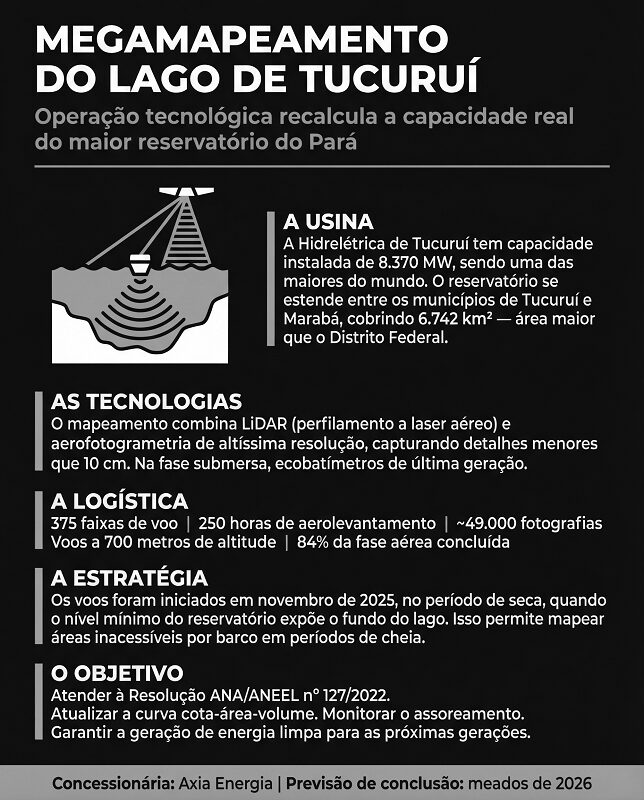 No coração da Amazônia paraense, uma operação de engenharia sem precedentes está em curso para desvendar um dos segredos mais bem guardados da Usina Hidrelétrica de Tucuruí: sua real capacidade de armazenamento de água. Com uma potência instalada de 8.370 Megawatts (MW), a usina, uma das maiores do planeta, é uma peça-chave no tabuleiro energético nacional. Saber com exatidão o volume de seu gigantesco reservatório é fundamental para otimizar a geração de energia e prevenir futuras crises de abastecimento.