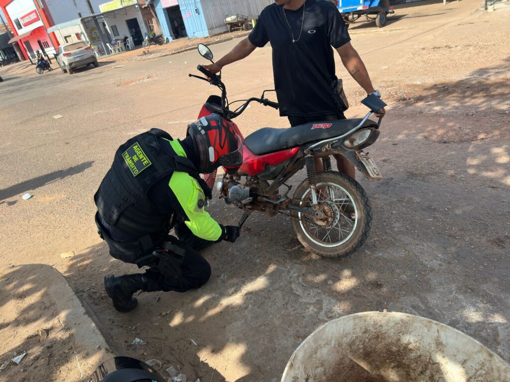Uma motocicleta com placa adulterada e motor com registro de furto foi apreendida na manhã desta terça-feira (4), em São Domingos do Araguaia. A ação foi conduzida por agentes do Departamento Municipal de Trânsito e Transporte Urbano (DMTU) durante uma ronda de rotina na BR-153, nas imediações da Praça Nossa Senhora de Fátima.