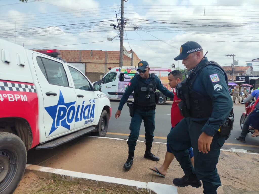 Um motociclista sem capacete e aparentemente embriagado foi flagrado pela Polícia Militar ultrapassando um perímetro na Folha 16, interditado pelo DMTU por conta do Círio de Nazaré neste domingo (19). De acordo com o 3º sargento PM J. Moraes, o homem desobedeceu à ordem de parada e acabou avançando sobre ele e outro policial.