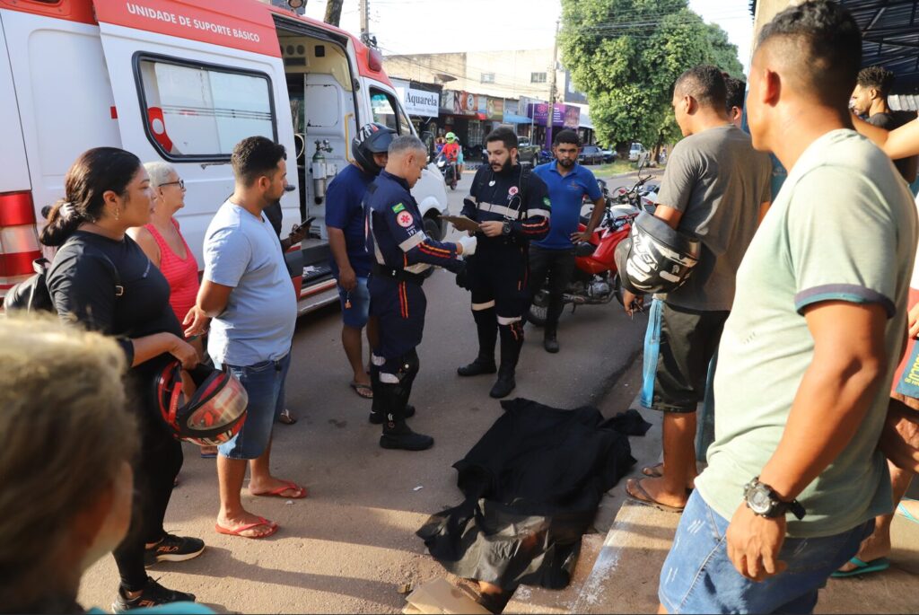 Ao perder o controle do veículo, ele caiu da moto e se chocou com a calçada de uma loja, enquanto a moto ainda segui cerca de 10 metros até a esquina.