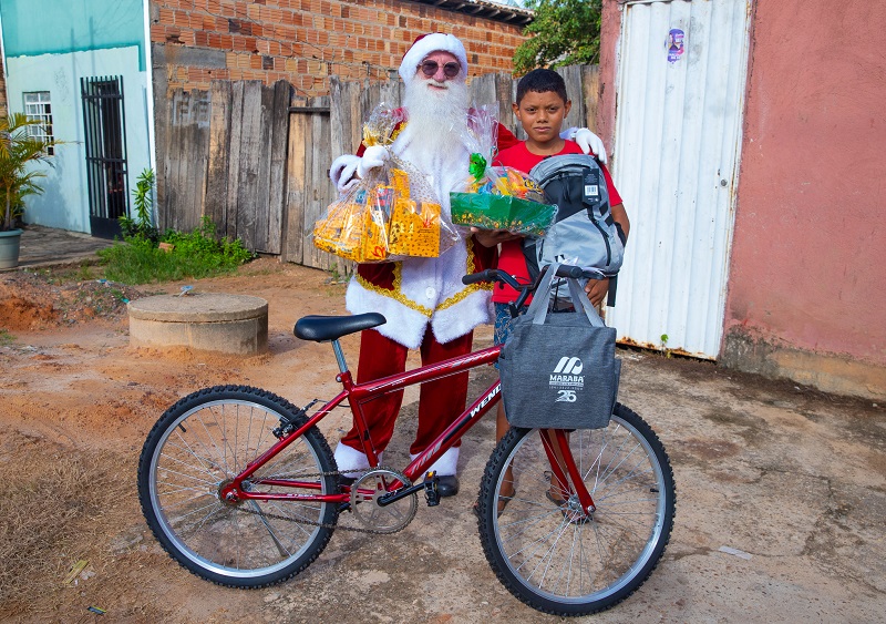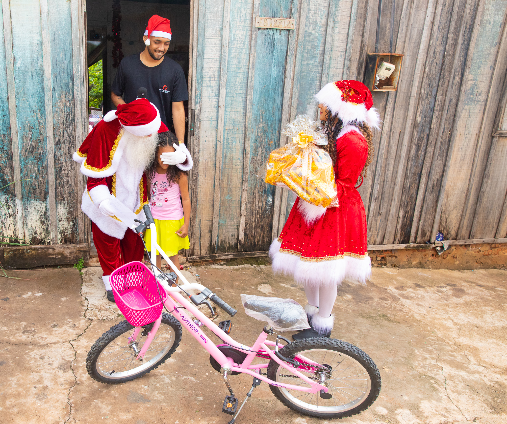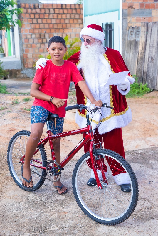 A recompensa veio em grande estilo. Papai Noel chegou de surpresa à comunidade para entregar o presente tão esperado. Franciel, que havia pedido uma bicicleta da Partiu Bike Shop, teve o desejo atendido e ainda ganhou outros itens que tornaram a data ainda mais especial.
