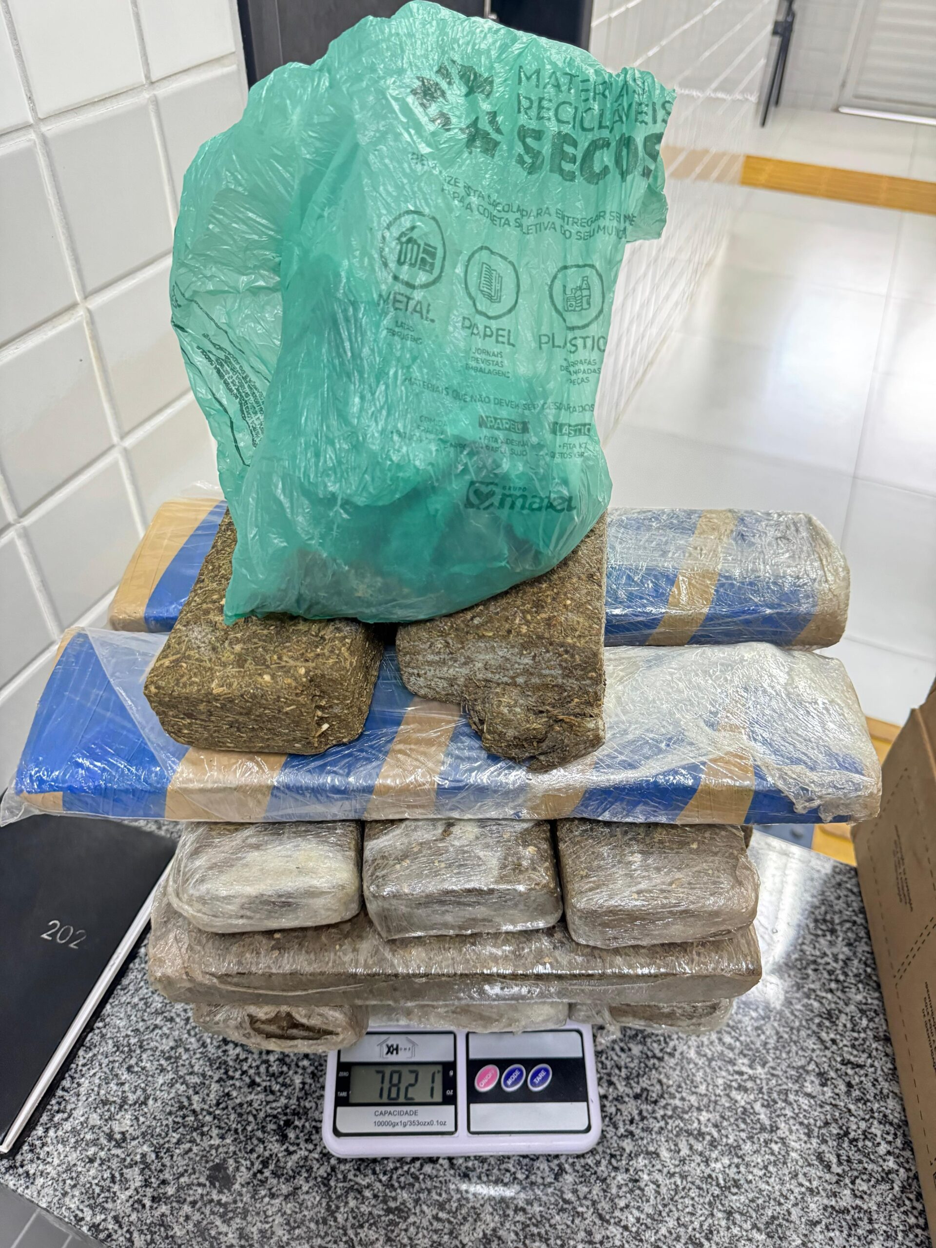 Os policiais encontraram uma pedra de crack pesando cerca de 173 gramas, escondida no bolso traseiro da bermuda do suspeito, além de 14 tabletes de maconha, totalizando aproximadamente 8 quilos da droga. Além dos entorpecentes, a equipe apreendeu três celulares danificados da marca Motorola e uma balança de precisão.