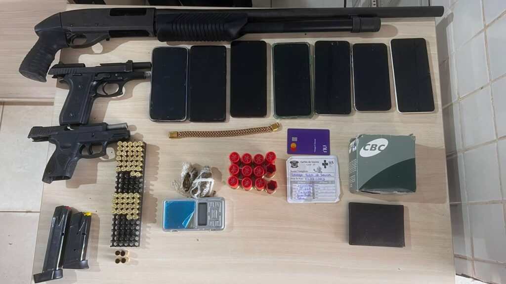 Com o grupo, foram apreendidos uma espingarda Gauge calibre 12, uma pistola calibre 380 e uma pistola Taurus calibre 9mm, além de nove munições calibre 9mm, 32 de calibre 380 e 10 de calibre 12, todas intactas. Também foram encontradas 10,2 gramas de maconha, sete aparelhos celulares e uma balança de precisão.