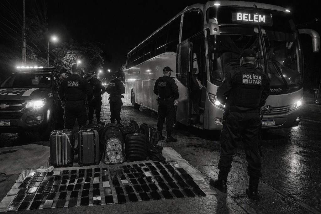 A abordagem ocorreu em um ônibus intermunicipal com destino a Belém. No veículo, os policiais identificaram Sérgio Jonathan Cadete Batista, de 29 anos, Jennifer Andreza Brito do Rosario, de 23 anos, e Darlene do Socorro Malcher Pereira, de 42 anos. Diante do comportamento suspeito do trio, a equipe realizou buscas pessoais e vistorias nas bagagens. No interior de três malas, foram localizados 87 aparelhos celulares, sendo 27 iPhones, 26 Samsung, 24 Xiaomi e 10 Motorola, além de oito cartões de crédito.