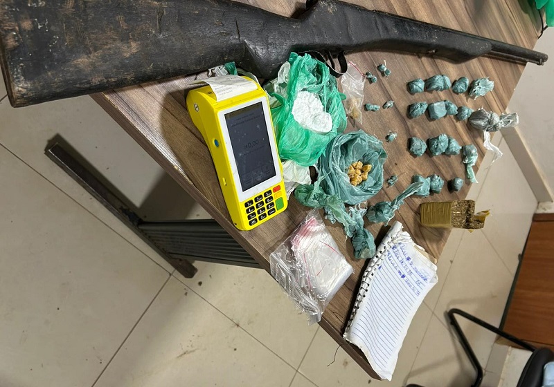 Na ação, foram apreendidos uma espingarda, papelotes de crack, cocaína e maconha, além de uma barra de maconha, uma máquina de cartão, invólucros plásticos e uma caderneta com anotações do tráfico.