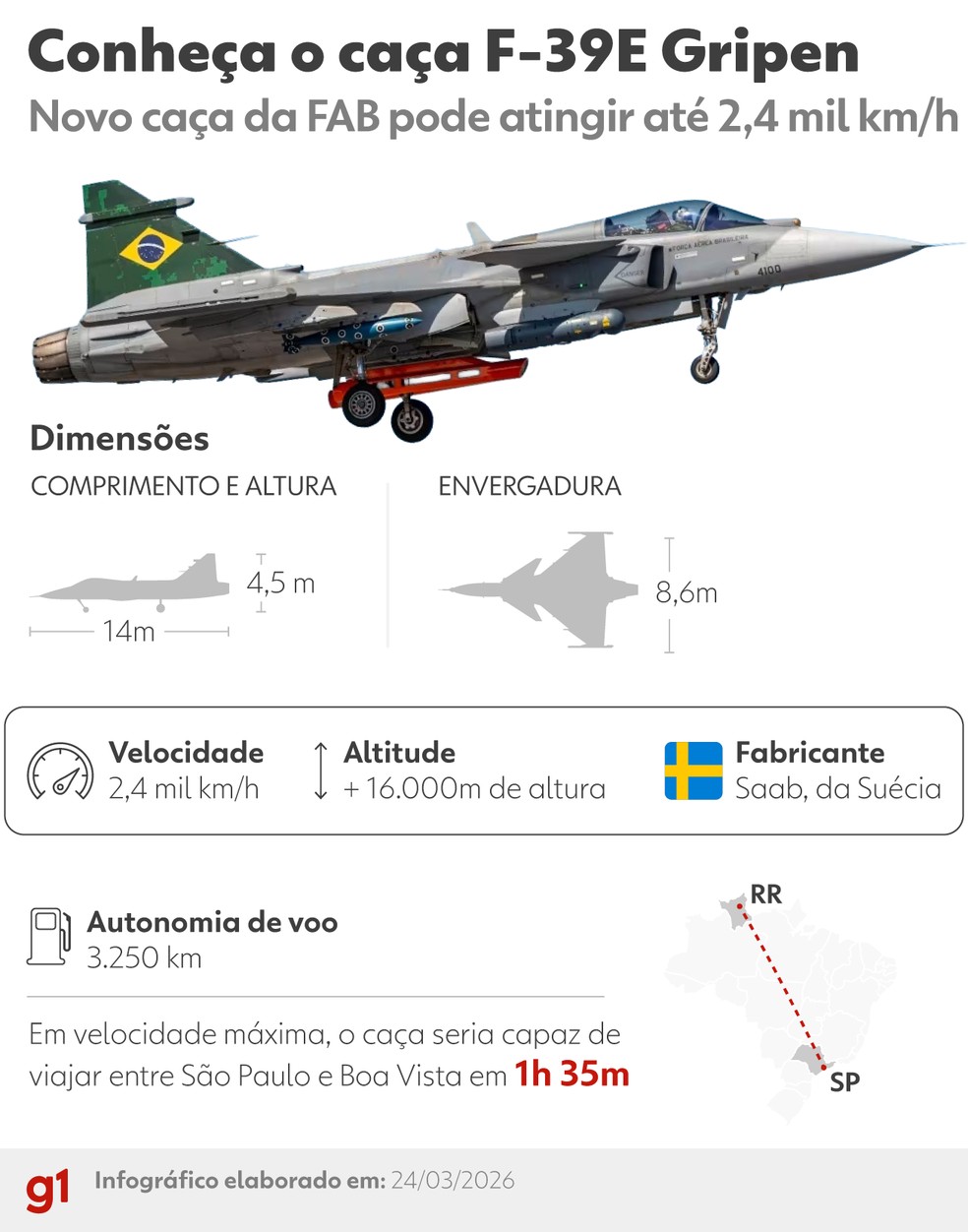 O primeiro caça supersônico F-39E Gripen produzido no Brasil será apresentado nesta quarta-feira (25), no aeródromo da Embraer, em Gavião Peixoto (SP). O evento terá a presença do presidente Lula e de autoridades a partir das 9h30.
