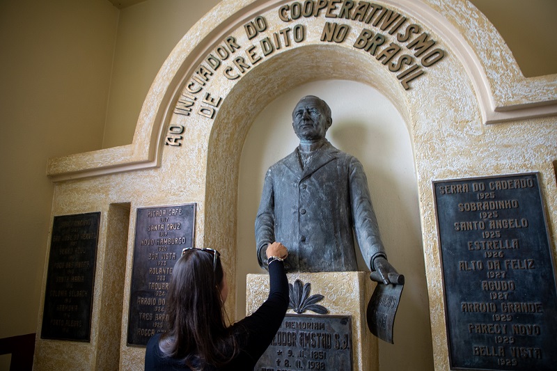 E quando eu achei que o cooperativismo de crédito não poderia me surpreender mais, conhecemos a história do padre suíço Theodor Amstad, patrono do cooperativismo brasileiro, na sede da primeira cooperativa da América Latina, localizada em Nova Petrópolis. Paulo Soares, educador, foi quem nos contou, de forma lúdica e imersiva, a verdadeira epopeia vivida por Amstad e sua mula Diana para trazer desenvolvimento financeiro e prosperidade para os moradores daquela região.