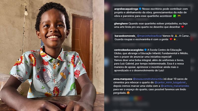 Outras demonstrações de carinho também surgiram. A artista visual Ghennitty Ferro prometeu: “Quando esse quartinho estiver pintadinho, eu faço uma arte linda para o seu quarto, no desenho que você escolher”. A especialista em voz infantil Miriã Rezende, da Aki Tem Kids, garantiu um curso de canto para Gabriel, “para que esse dom tão lindo que ele tem possa brilhar ainda mais”.