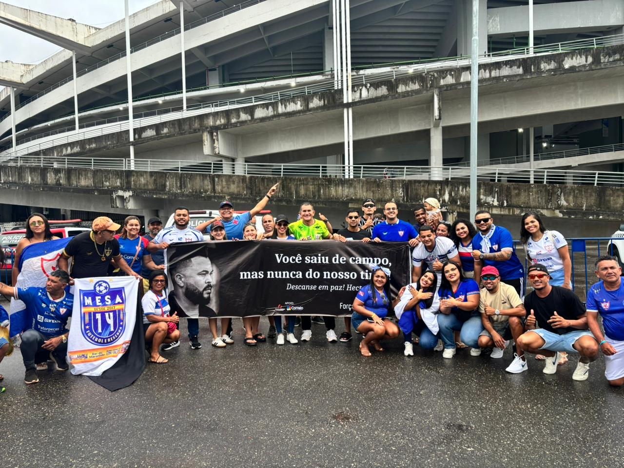 Os dizeres da faixa eram: “Você saiu campo, mas nunca do nosso time! Descanse em paz, Hecton” e “Força, técnico Tyezer”.