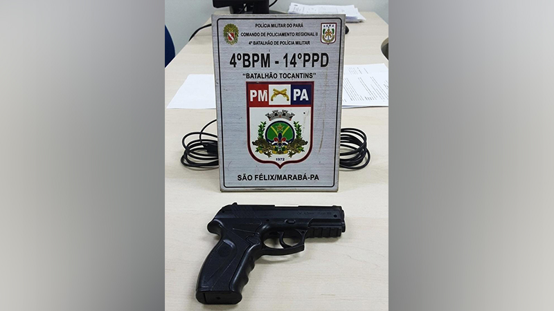 Kauã Conceição Silva de Jesus foi apresentado na Delegacia de Polícia Civil, em Marabá, suspeito de violência doméstica na madrugada de segunda-feira (9). O caso foi registrado na Rodovia PA-150, próximo a uma distribuidora, no Bairro São Félix II. Com ele, foi apreendido um simulacro de pistola calibre 4,5 mm.