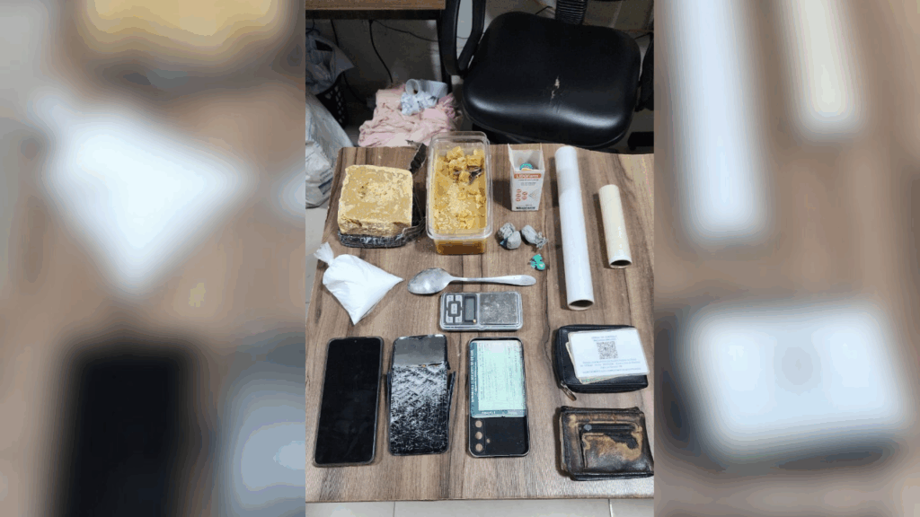 Durante as buscas, os policiais apreenderam 1,183 kg de crack, 107 mg de cocaína, uma balança de precisão, rolos de papel filme, uma vasilha com porções da droga, além de dois celulares e documentos pessoais.