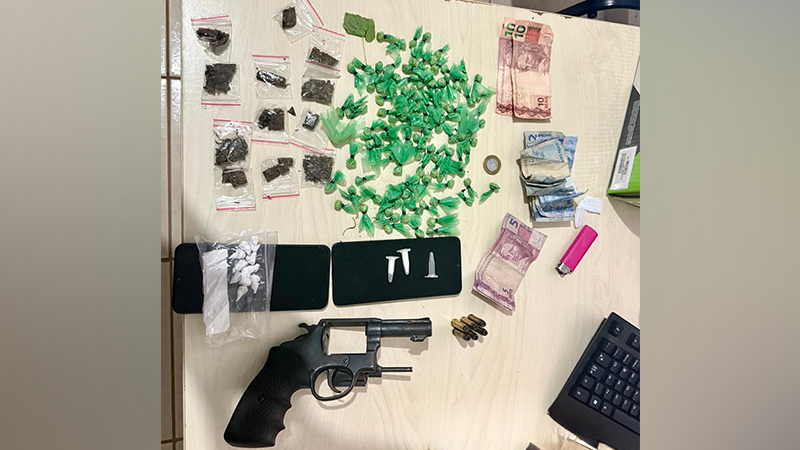 Ao notar a aproximação dos policiais, ele demonstrou nervosismo e tentou se desfazer do acessório, arremessando-o em uma área de matagal próxima. A pochete foi localizada contendo porções de drogas, além de uma arma de fogo, munições, dinheiro em espécie e um telefone celular.