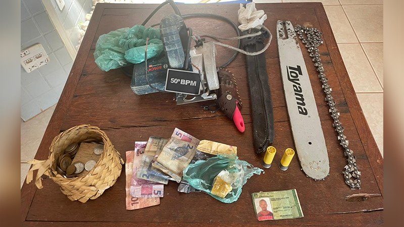 Leia mais:No interior do imóvel, foram localizadas peças que seriam da motosserra furtada. Além disso, a guarnição apreendeu uma pedra de oxi, pesando 23 gramas, duas munições calibre 20, duas armas brancas (uma faca e um facão), uma corrente e um sabre — itens pertencentes à motosserra — além de R$ 73,85 em dinheiro.