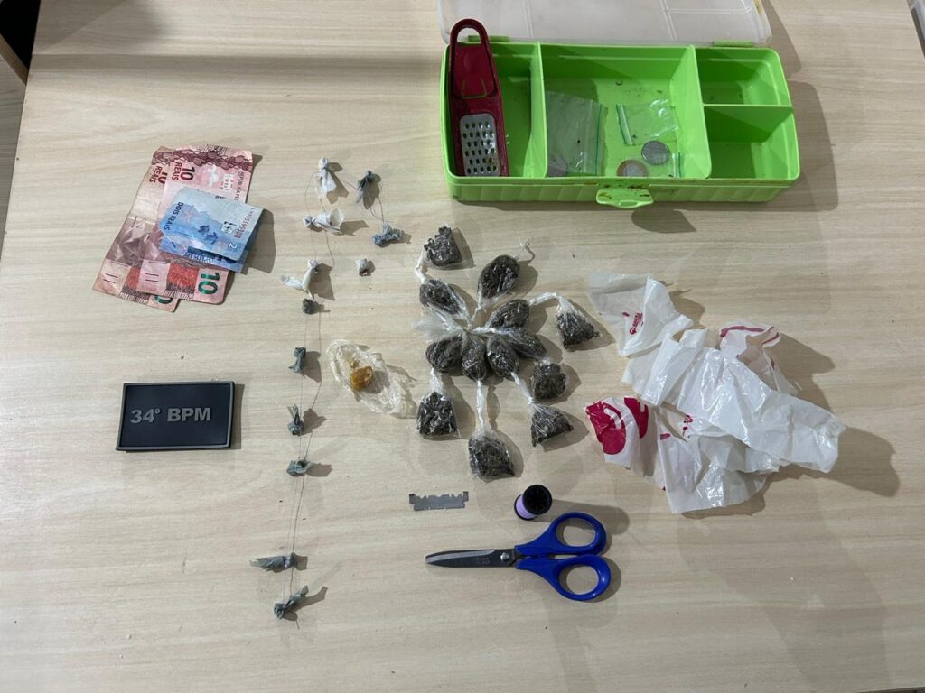 No interior do imóvel, os militares encontraram duas pedras de crack, além de nove petecas pequenas e uma maior. Também foram recolhidas 13 porções de maconha, materiais utilizados para embalar drogas e R$ 24 em notas trocadas, o que, segundo a polícia, ressalta a suspeita de comercialização no local.