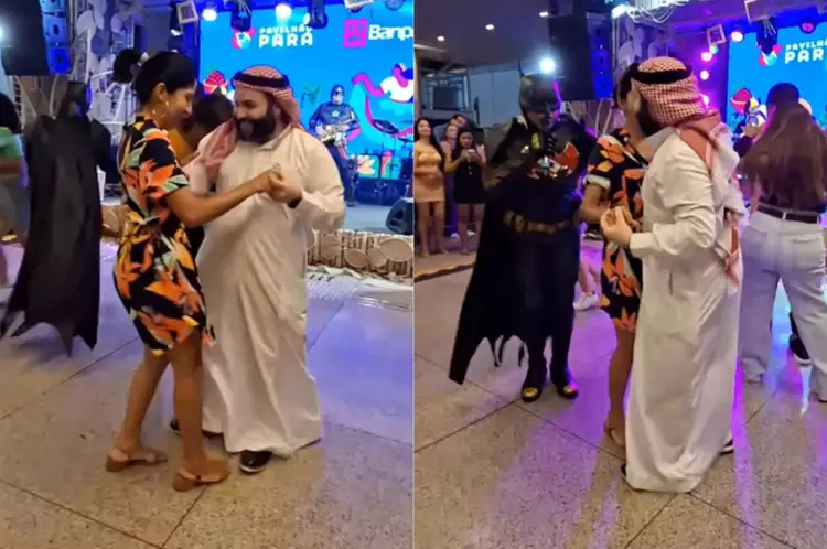O homem que aparece no registro é o sírioAbdul Jarour, ativista e político naturalizado brasileiro, que está na capital para participar de atividades ligadas ao evento. Nas imagens, ele tenta acompanhar os passos de uma paraense enquanto o vocalista, caracterizado como Batman, incentiva o público a entrar na dança.